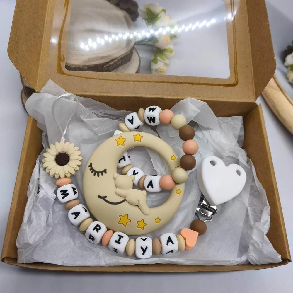 Coffret naissance personnalisé lune beige fleurie tout silicone