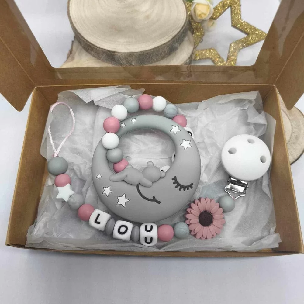 Coffret naissance personnalisé lune gris fleurie tout silicone