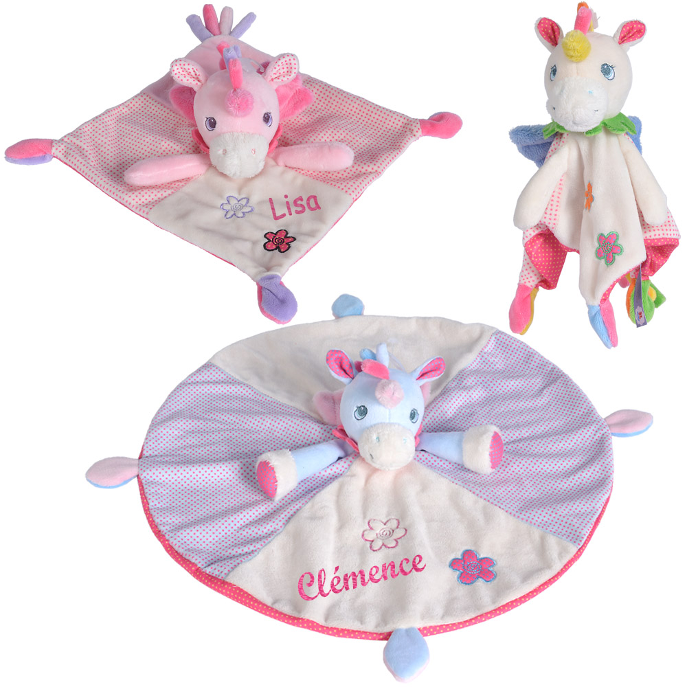 Doudou hochet Licorne personnalisé avec le prénom de bébé
