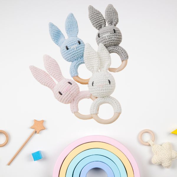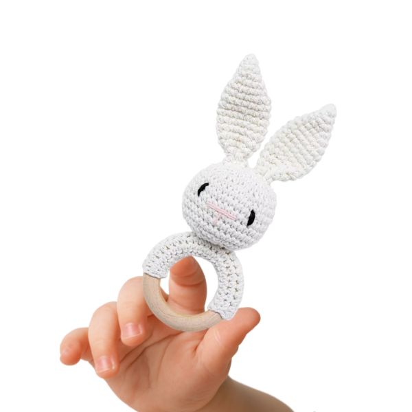 L’anneau de dentition en bois et crochet avec une adorable tête de lapin disponible en blanc, rose, bleu ou gris est l’accessoire parfait pour accompagner votre bébé dans les premiers mois de sa vie. Conçu pour soulager les douleurs liées à la poussée dentaire, cet anneau associe deux matériaux doux et sûrs: du bois naturel non traité et du coton crocheté à la main. Il n’est pas seulement un produit fonctionnel, mais aussi un compagnon ludique qui captivera l’attention de votre enfant.