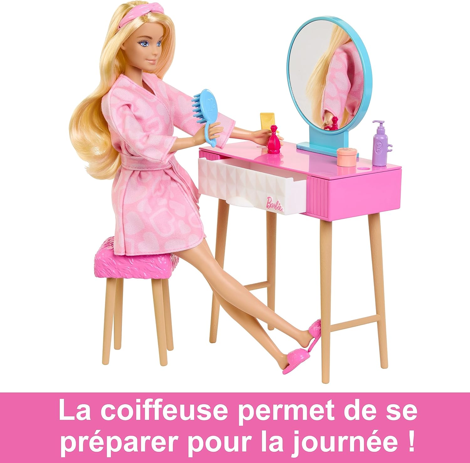 • Coiffeuse Élégante : Avec un miroir et plusieurs compartiments de rangement, la coiffeuse est parfaite pour que Barbie se prépare chaque matin.