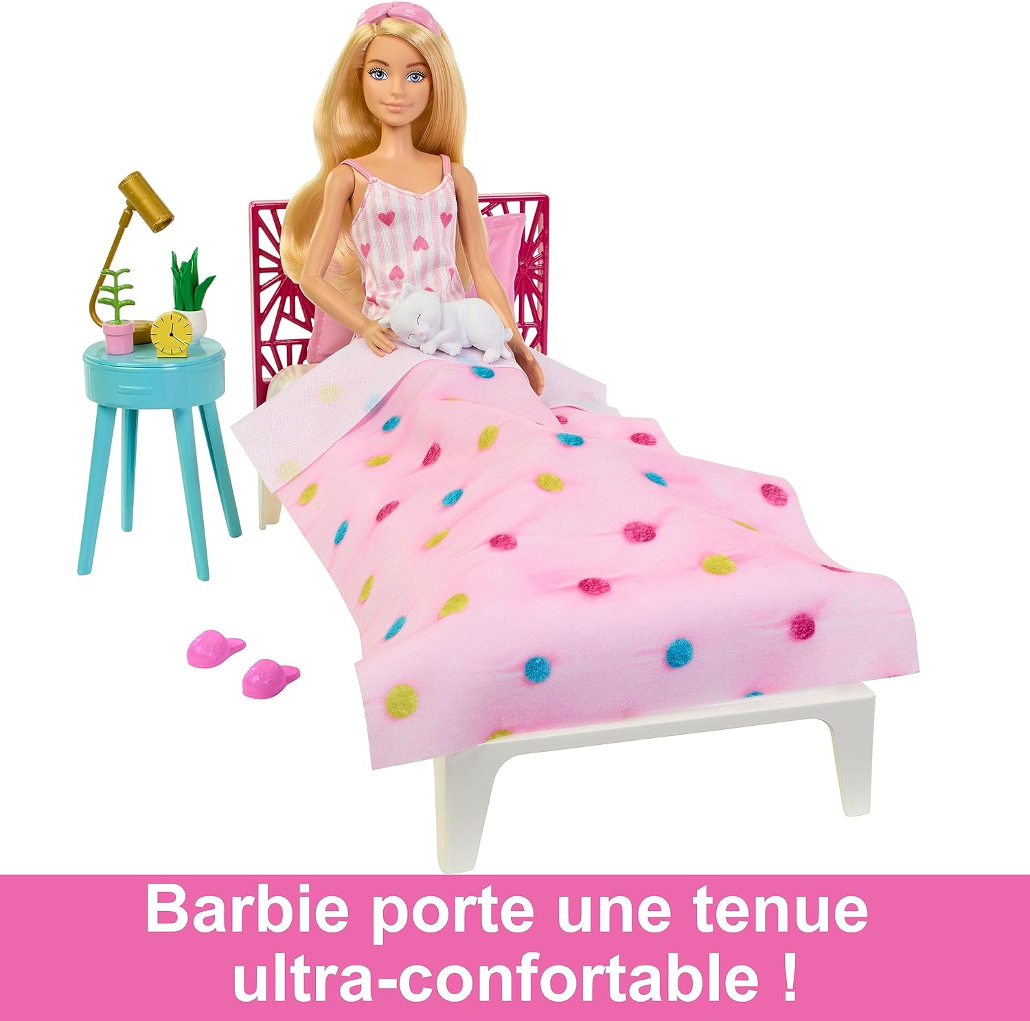 • Poupée Barbie : Prête pour une bonne nuit de sommeil ou pour commencer une journée en beauté, Barbie porte un adorable pyjama à motif et des chaussons duveteux. Sa robe de chambre rose en peluche ajoute une touche supplémentaire de confort.