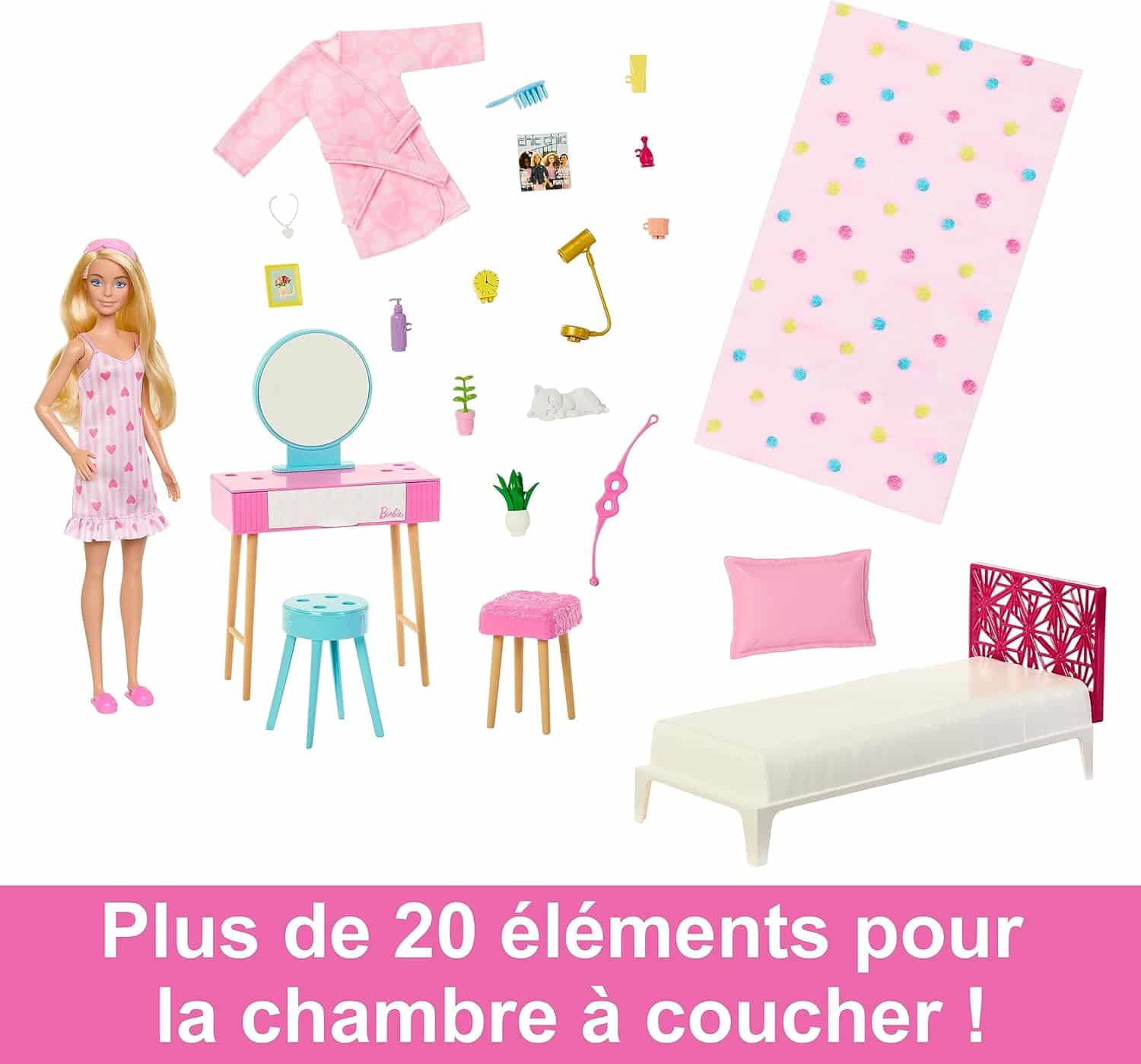 Le coffret « La Chambre de Barbie » est idéal pour les enfants qui aiment les jeux de rôle. Voici ce que vous trouverez dans cet ensemble :