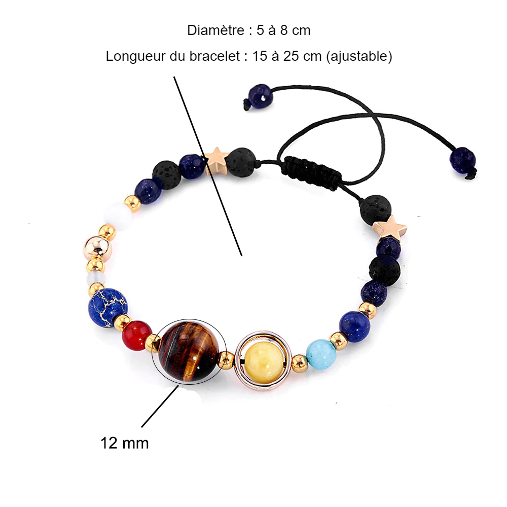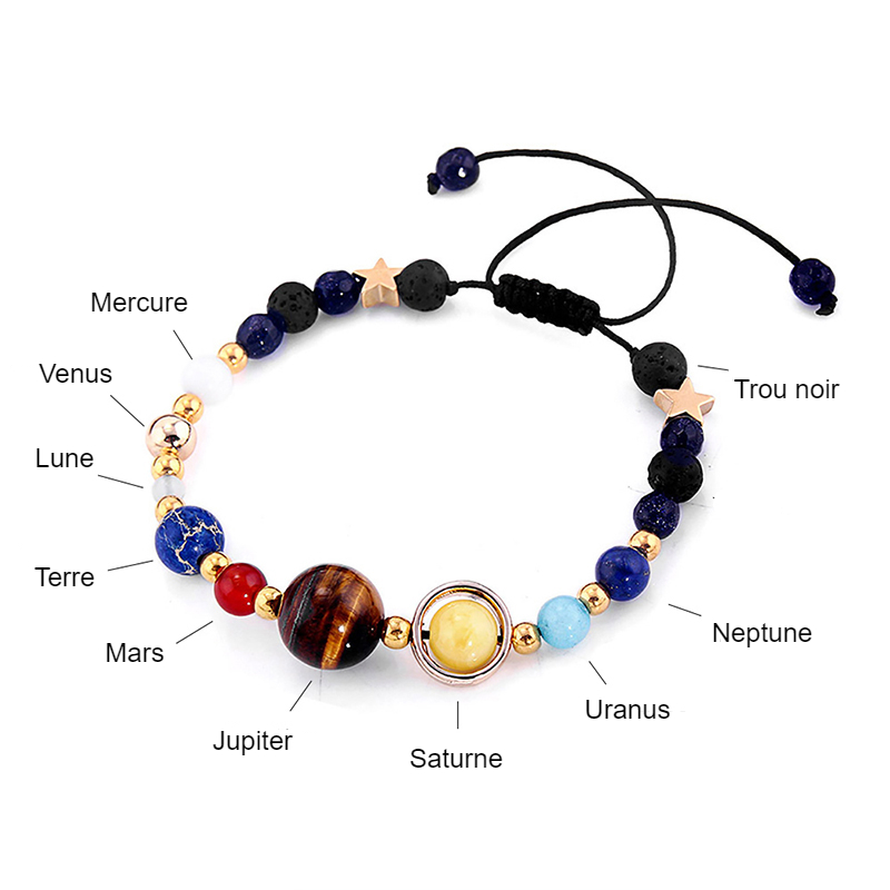 Ce superbe bracelet pour fille ou garçon est fait de pierres dont chacune représente une des 8 planètes de notre système solaire. Jupiter est la plus grosse perle. On voit la Terre, Vénus, Saturne avec son disque, Neptune, Uranus, Mercure et Pluton. Il y a aussi la lune et les trous noirs.