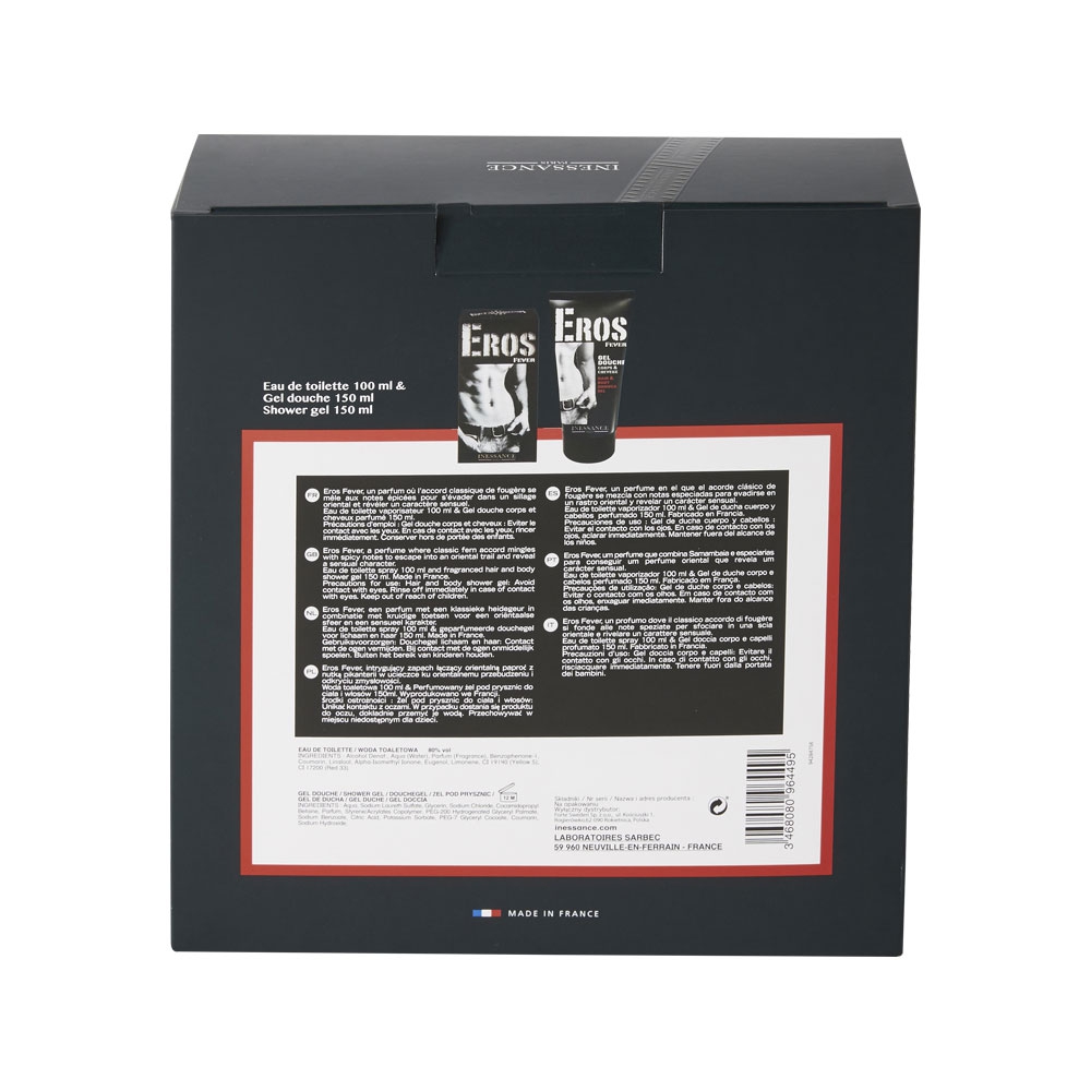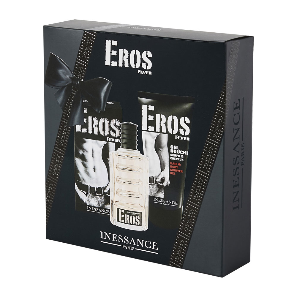 Le coffret Eros Fever de Inessance contient une Eau de Toilette 100ml et un Gel Douche Corps & Cheveux 150ml:
