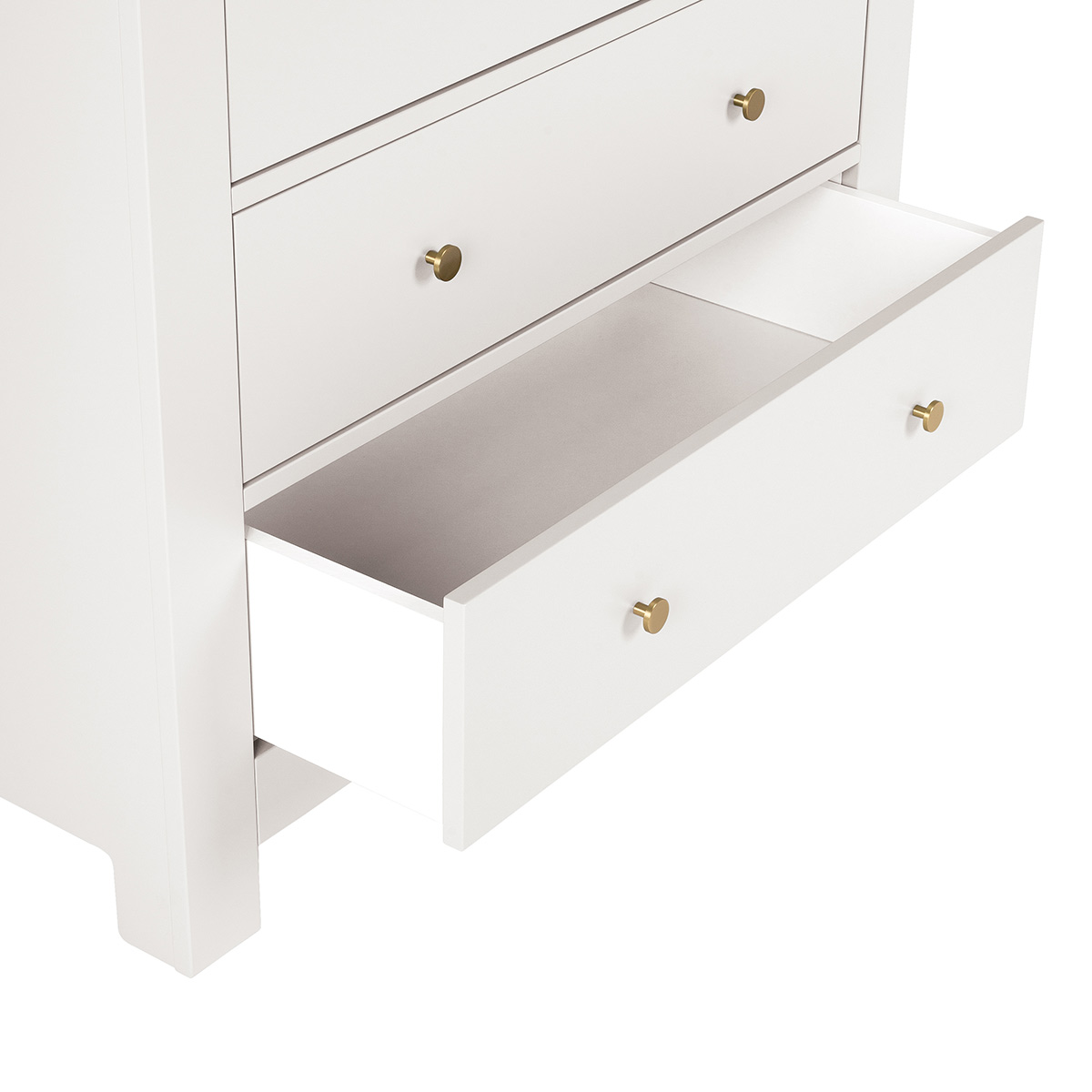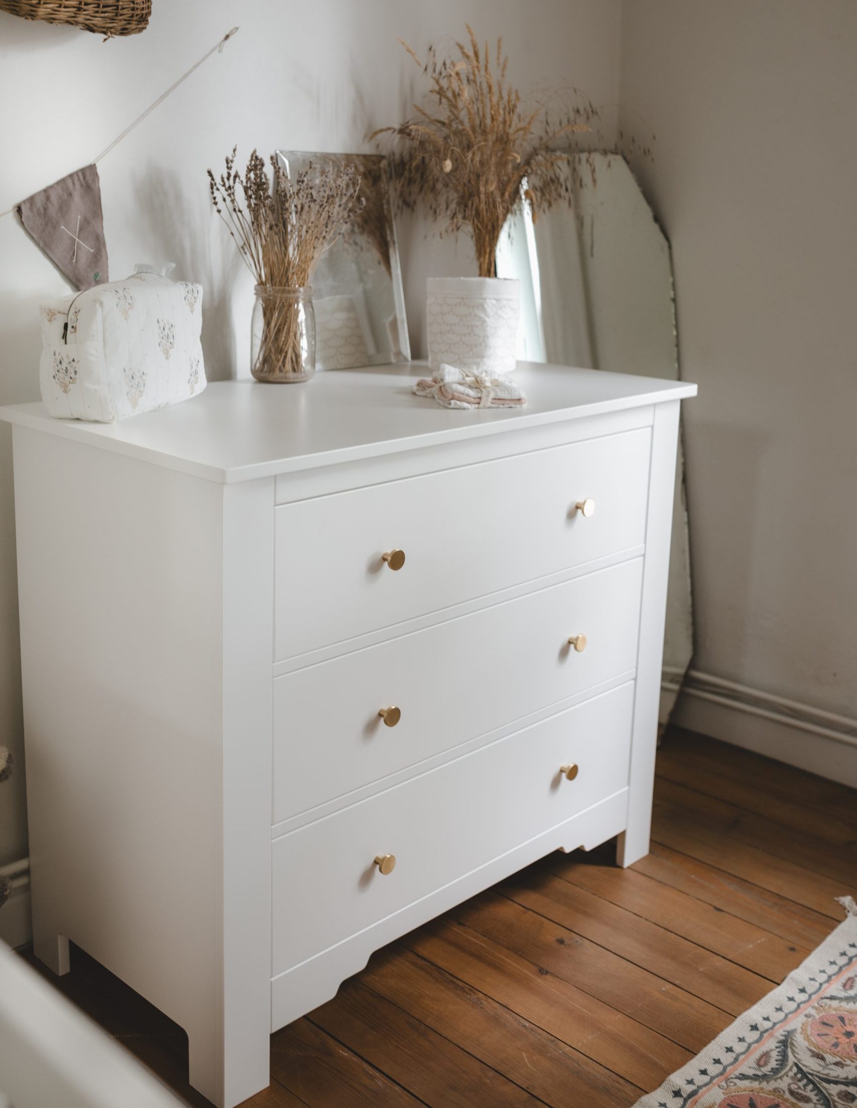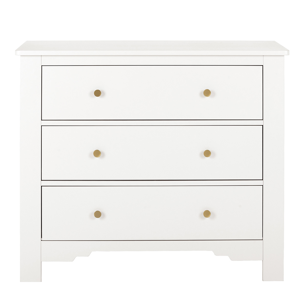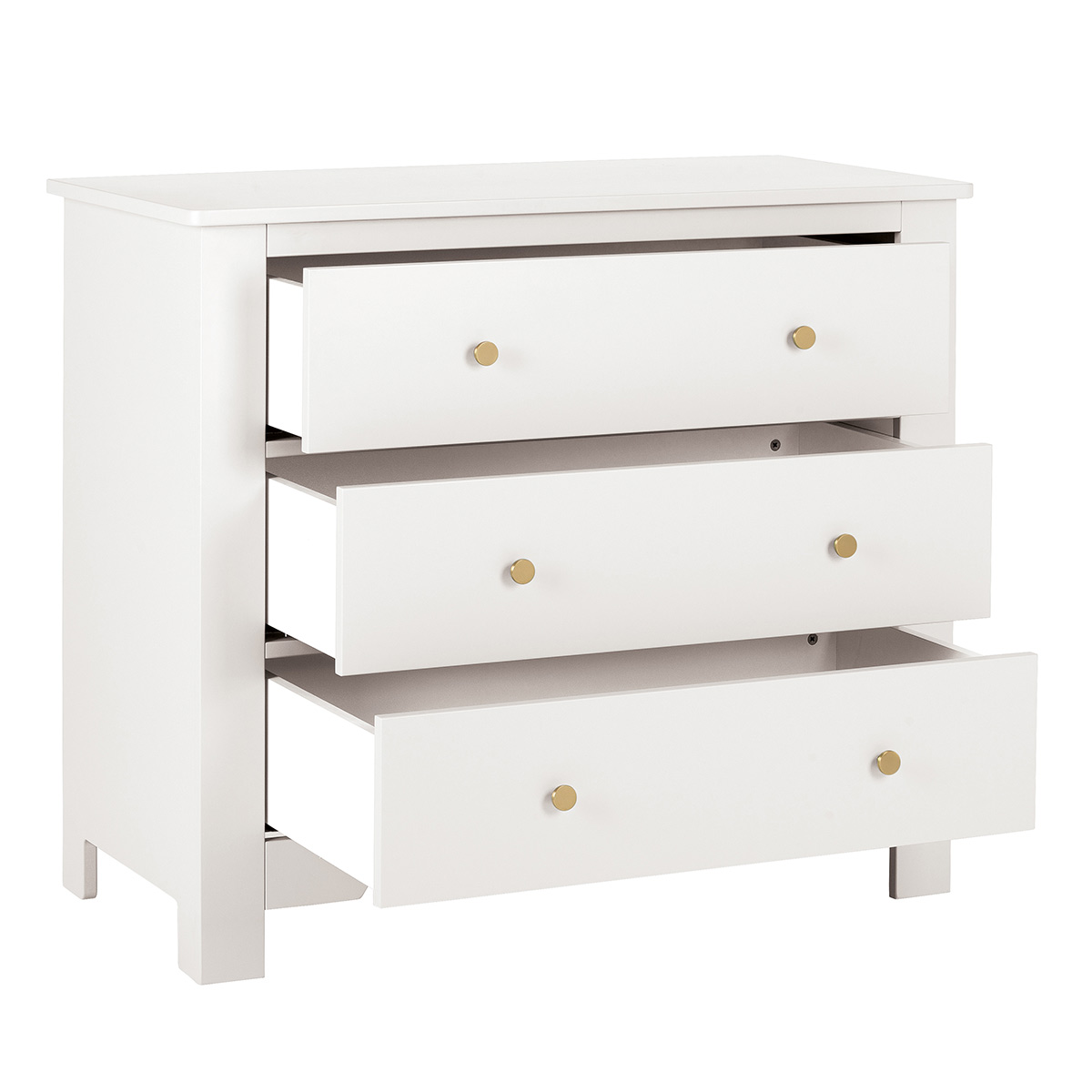 Fabriqué en France, ce meuble de qualité sans vis apparente comprend trois grands tiroirs équipés du système de fermeture soft-close. Il offre une belle finition de peinture à base aqueuse satinée et douce au toucher.