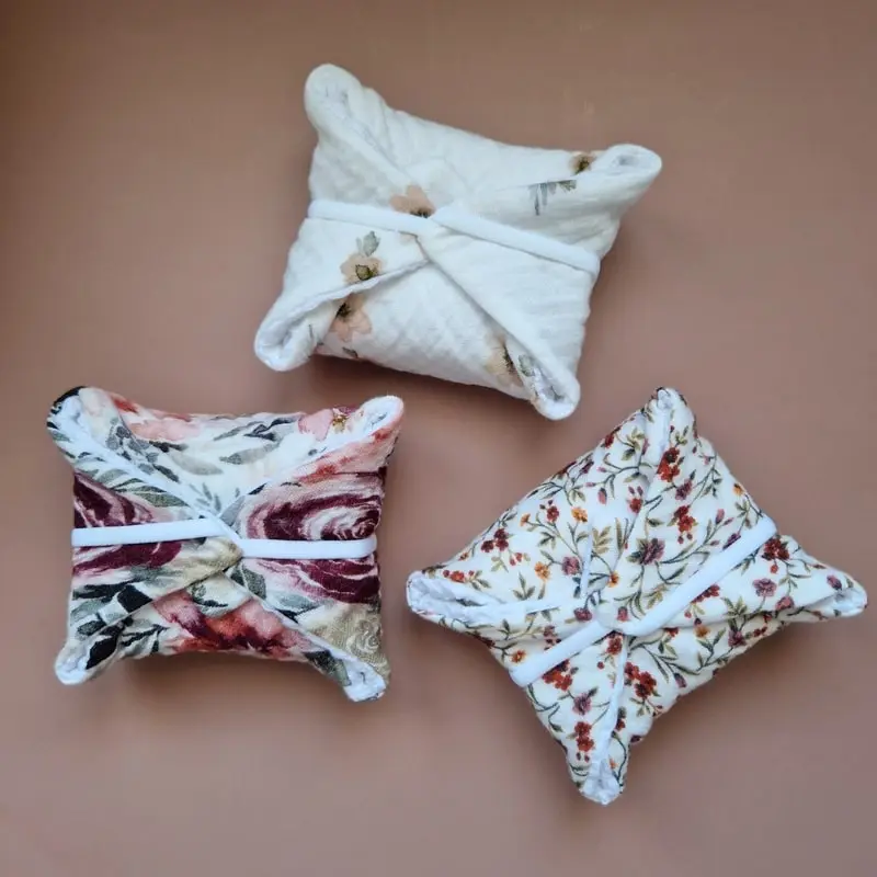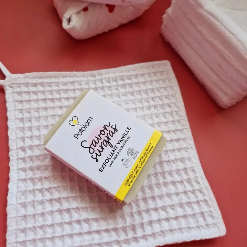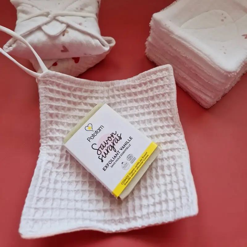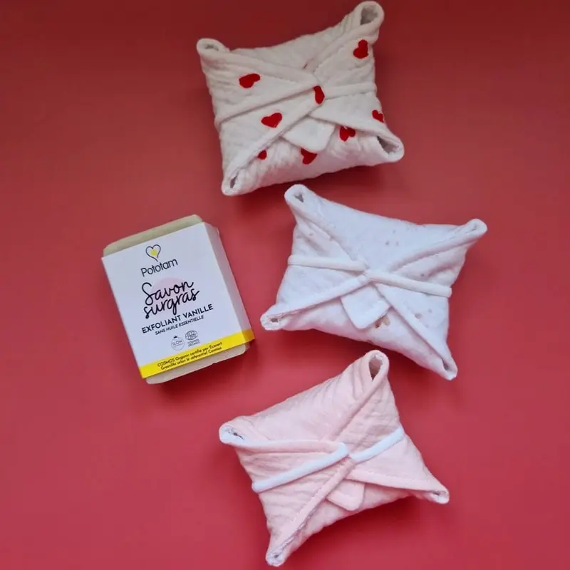 En double gaze et nid d’abeille, l’enveloppe à savon permet de transporter le savon de bébé, partout, sans tracas, jusqu’à Ushuaia !