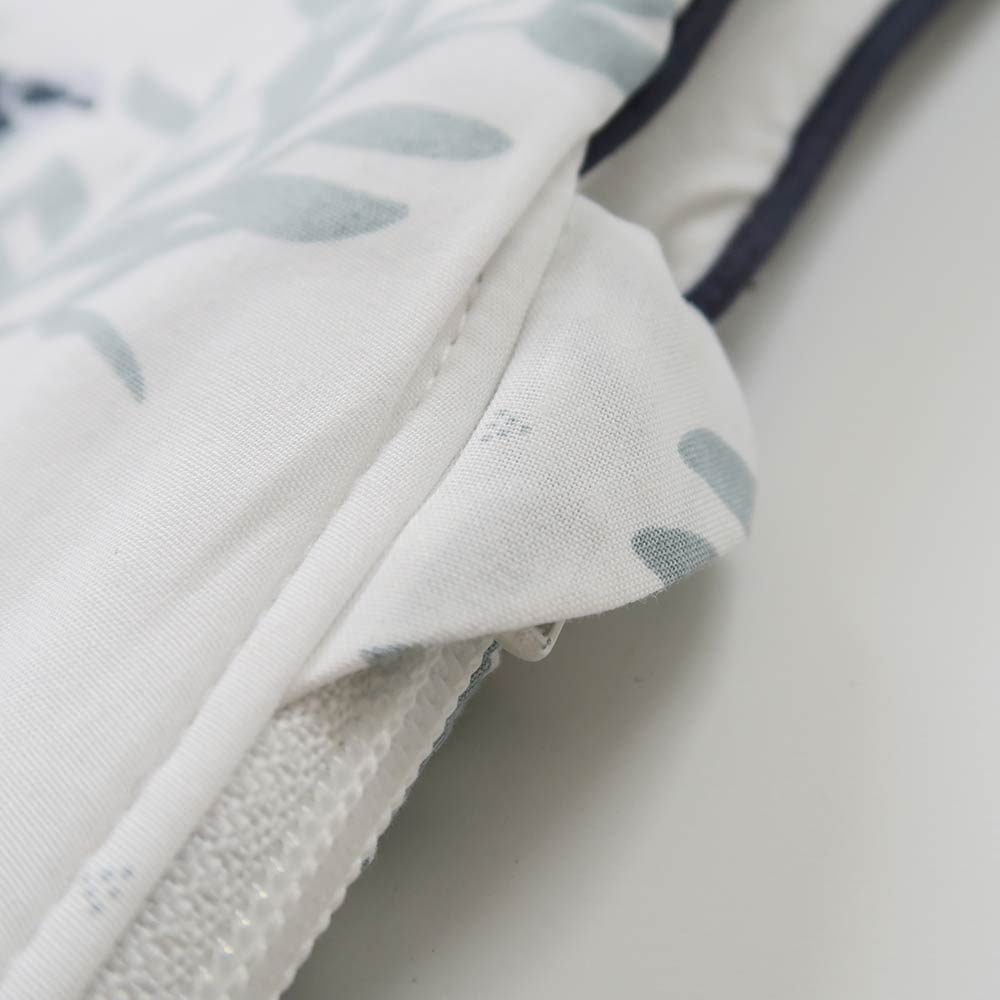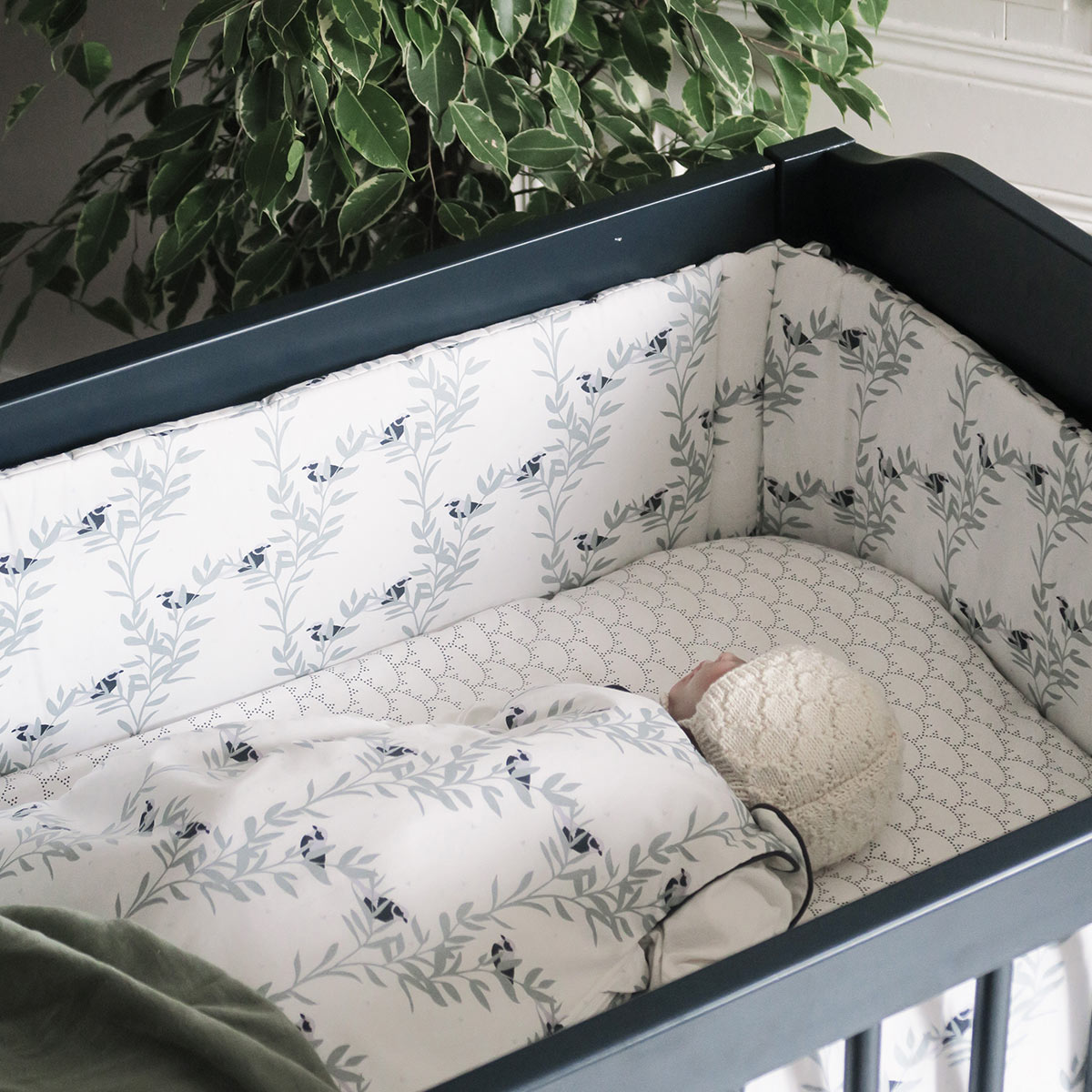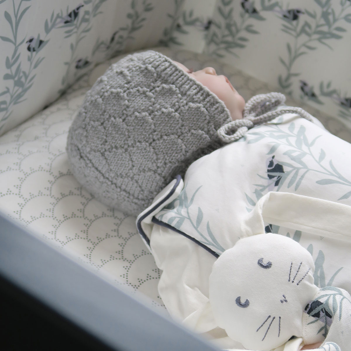 Son imprimé poétique et délicat souligné d’un passepoil saura inspirer de doux rêves à bébé.