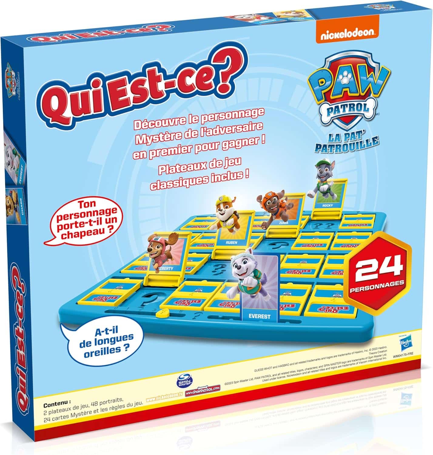 Le jeu de société Qui Est-ce ? Pat’Patrouille est basé sur le concept classique du jeu « Devine qui je suis » : chaque joueur choisit un personnage de la Pat’Patrouille et doit poser des questions pour découvrir le personnage choisi par l’autre joueur.