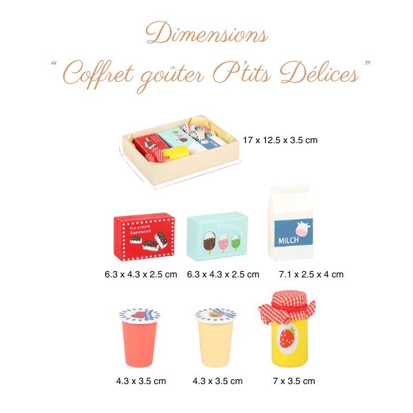 - Contenu : 6 pièces alimentaires en bois (lait, glace, confiture, gobelets, etc.)