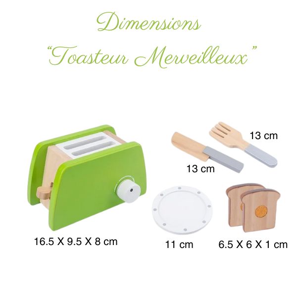 Le kit comprend 2 adorables tranches de pain en bois, chacune ornée d’un joli petit cercle jaune pour simuler une bonne dose de beurre fondant. Ces tartines sont parfaitement ajustées pour s’insérer dans le grille-pain, ce qui ajoute une dimension réaliste et ludique au jeu. Attention, vos enfants risquent de devenir de vrais experts en préparation de « toasts à la perfection » !