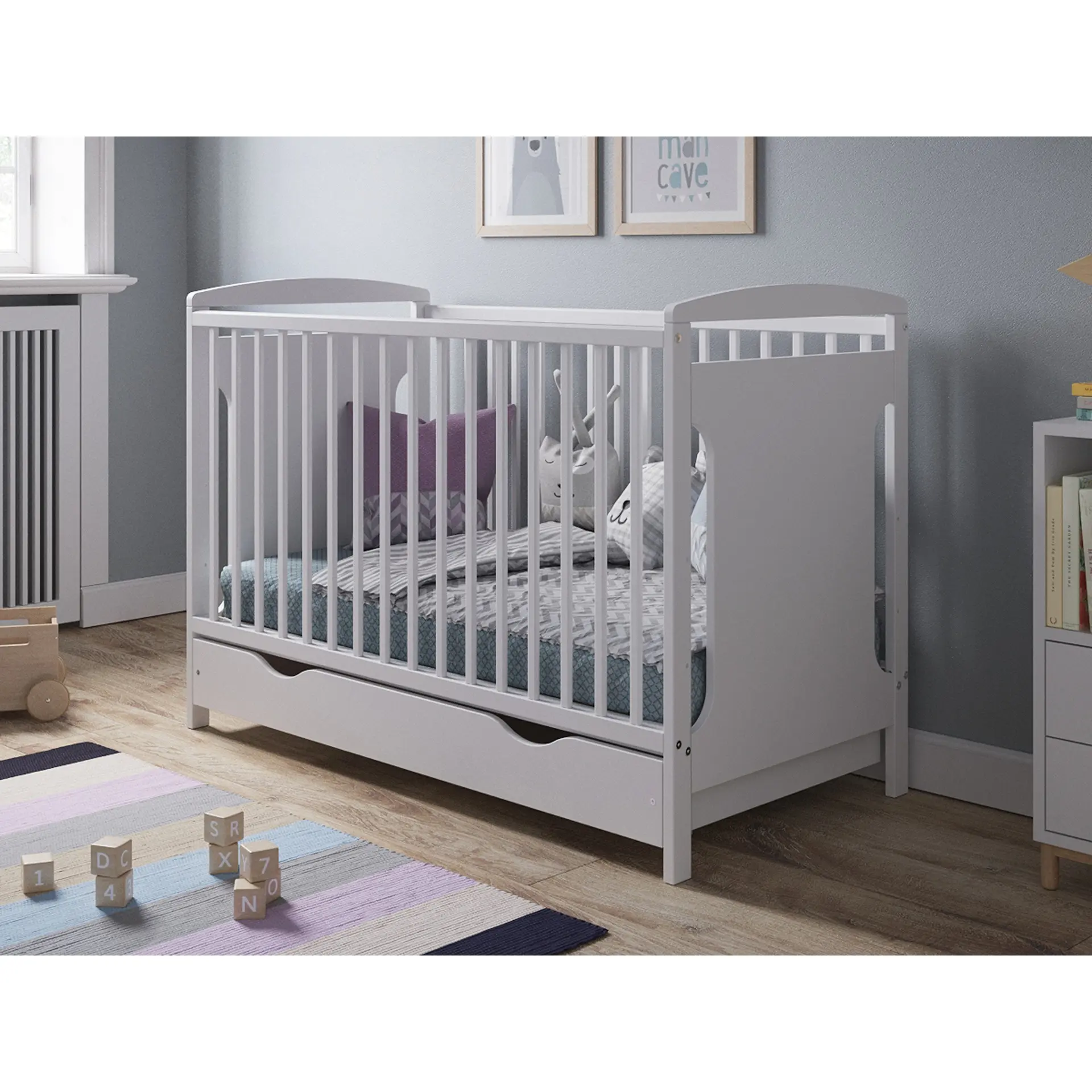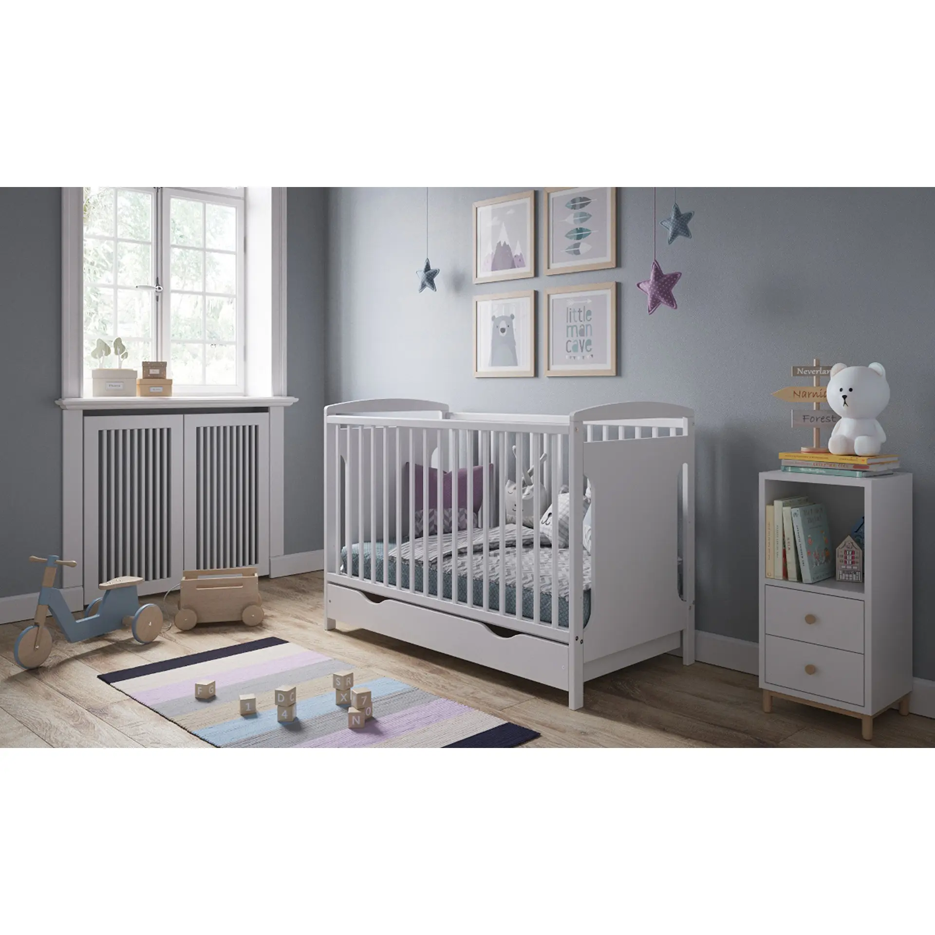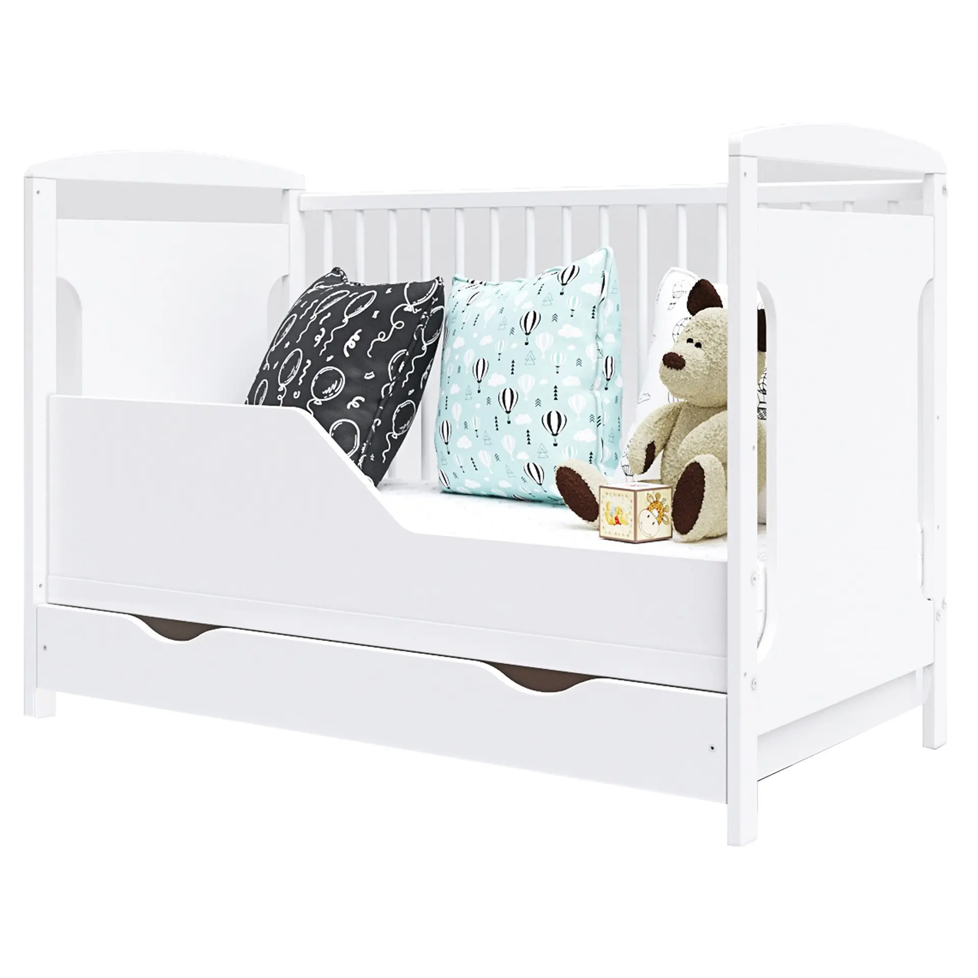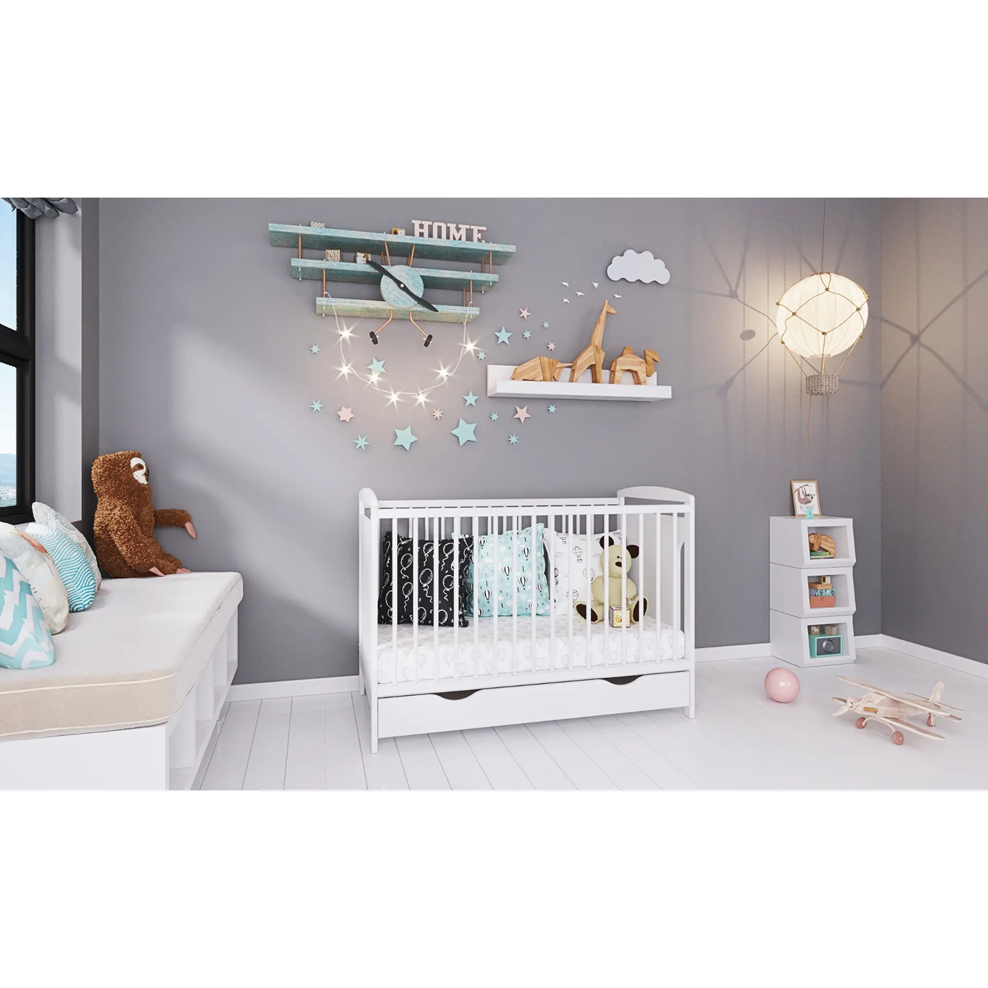 Le lit dispose d’un astucieux tiroir à roulettes pour pouvoir y ranger les jouets de bébé ou le linge de lit.