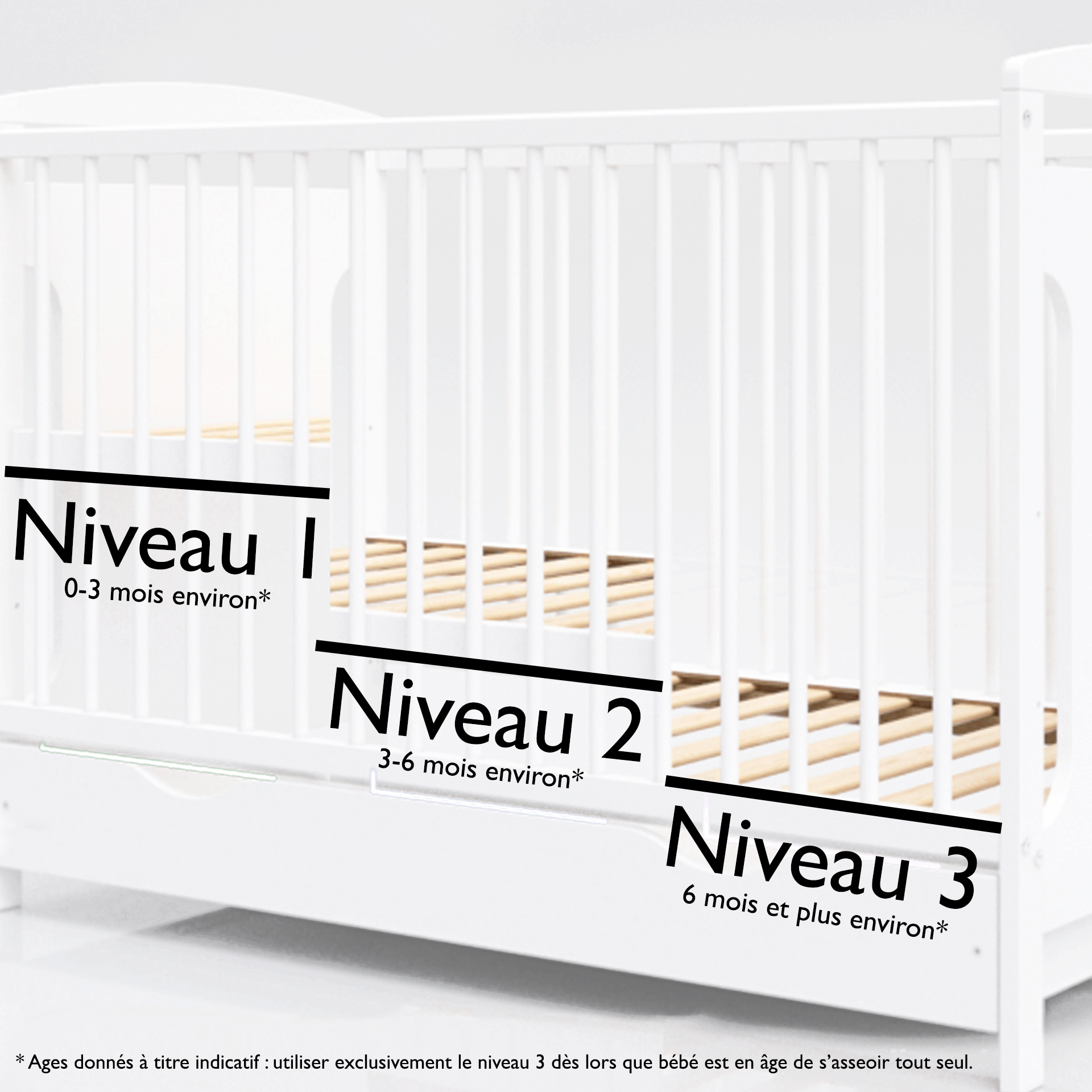 Le sommier du lit peut être positionné sur trois niveaux de hauteur différents afin de s’adapter à la croissance de bébé.