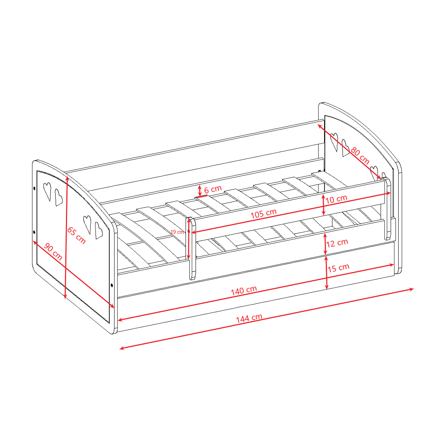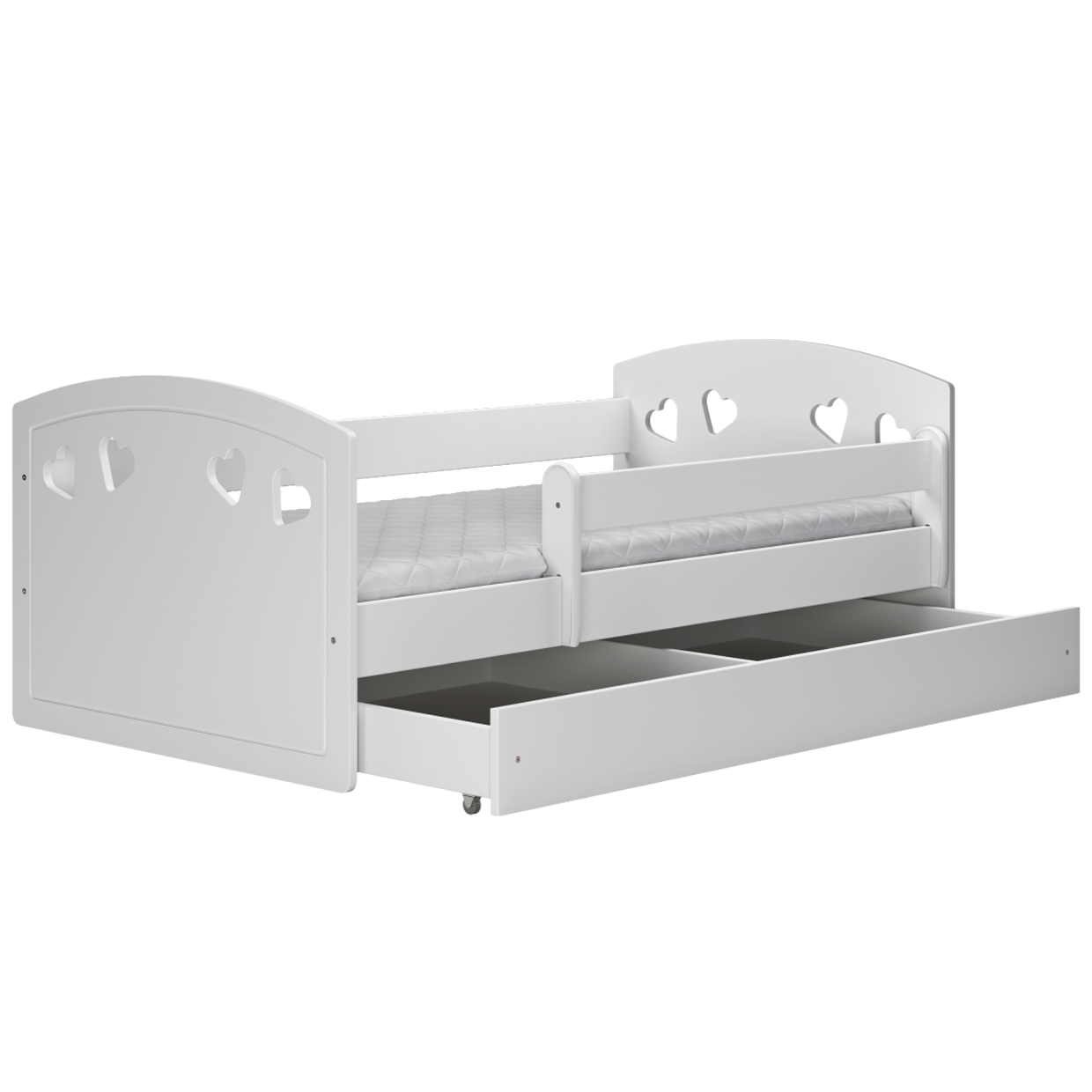 Avec son joli design, le lit pour enfant JULIA et ses jolis petits cœurs trouve facilement sa place dans tous les styles de chambre. C’est le lit idéal à utiliser après le lit bébé à barreaux. Sa barrière de sécurité amovible permet un passage en douceur vers un vrai lit de grands et d’éviter ainsi tout risque de chute pendant la nuit. Tous les angles du lit sont arrondis pour éviter les petits bobos du quotidien.