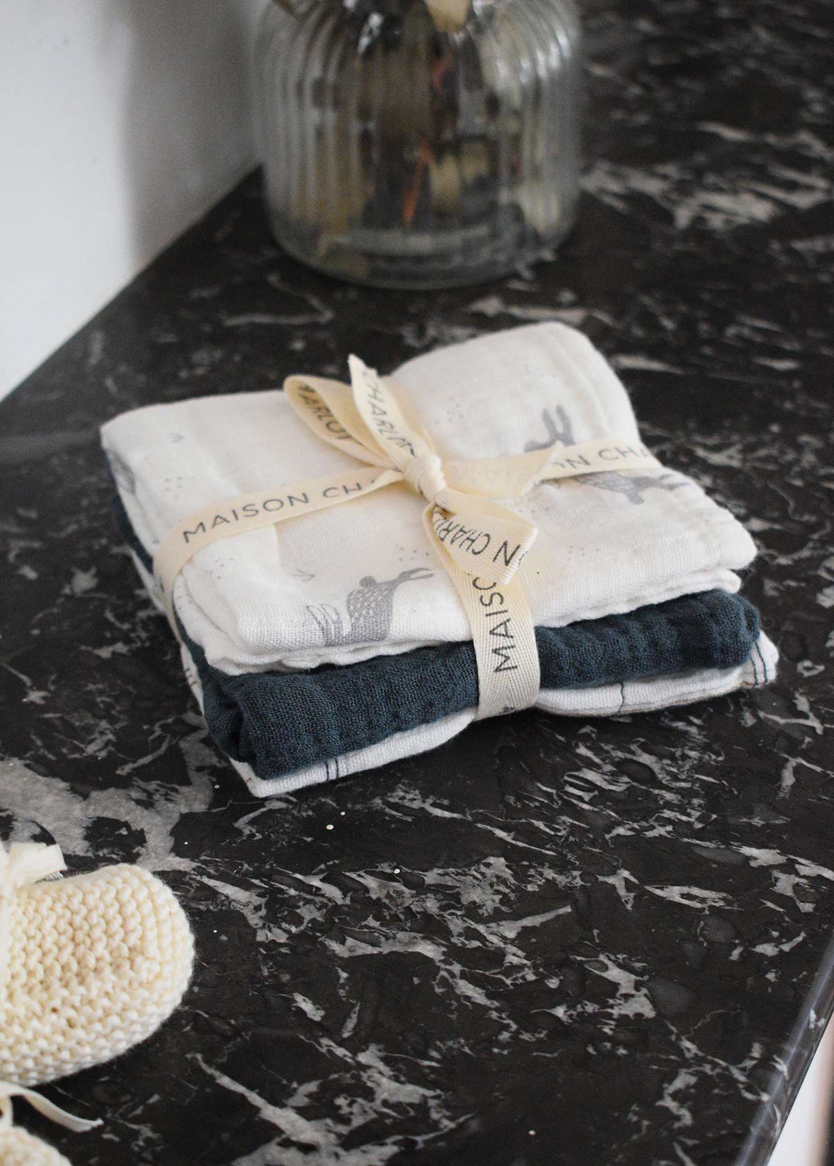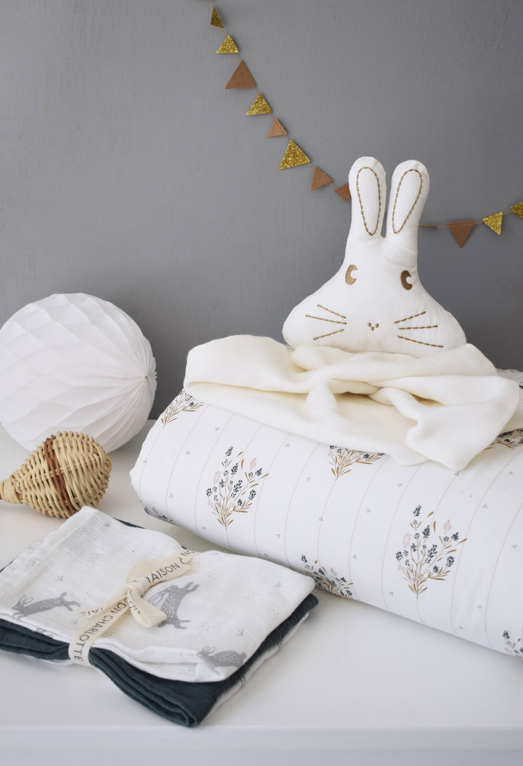 Les langes de la collection Belleville charmeront votre enfant ! Les délicats petits lapins et les élégants carreaux seront un havre de tendresse pour votre petit qui adorera se lover dans la douce gaze de coton biologique. Maison Charlotte a pris soin de confectionner ces textiles pour qu’ils respectent la peau de votre enfant et ainsi lui garantir des nuits sereines. Ces langes de 36×36 cm sont habillés de trois motifs différents. On trouve les lapins de la collection Belleville, les carreaux Saint-Honoré et un uni bleu afin de varier les styles. Vous pourrez associer ce lot de langes au textile de lit des collection Belleville ou Saint-Honoré.