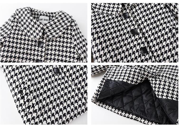 Le manteau est noir et blanc, mi-long, fabriqué en coton. Il se ferme avec 4 boutons noirs.