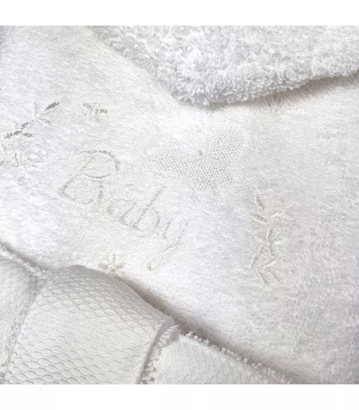 Un beau peignoir pour bébé “très chic ” en éponge douce et absorbante, avec une délicate broderie BABY papillon et petites fleurs brodés en blanc ton/ton au dos, un large biais en tissu blanc fantaisie (esprit nid d’abeille) est cousu sur le bas des manches, la ceinture, les poches et le col du peignoir.