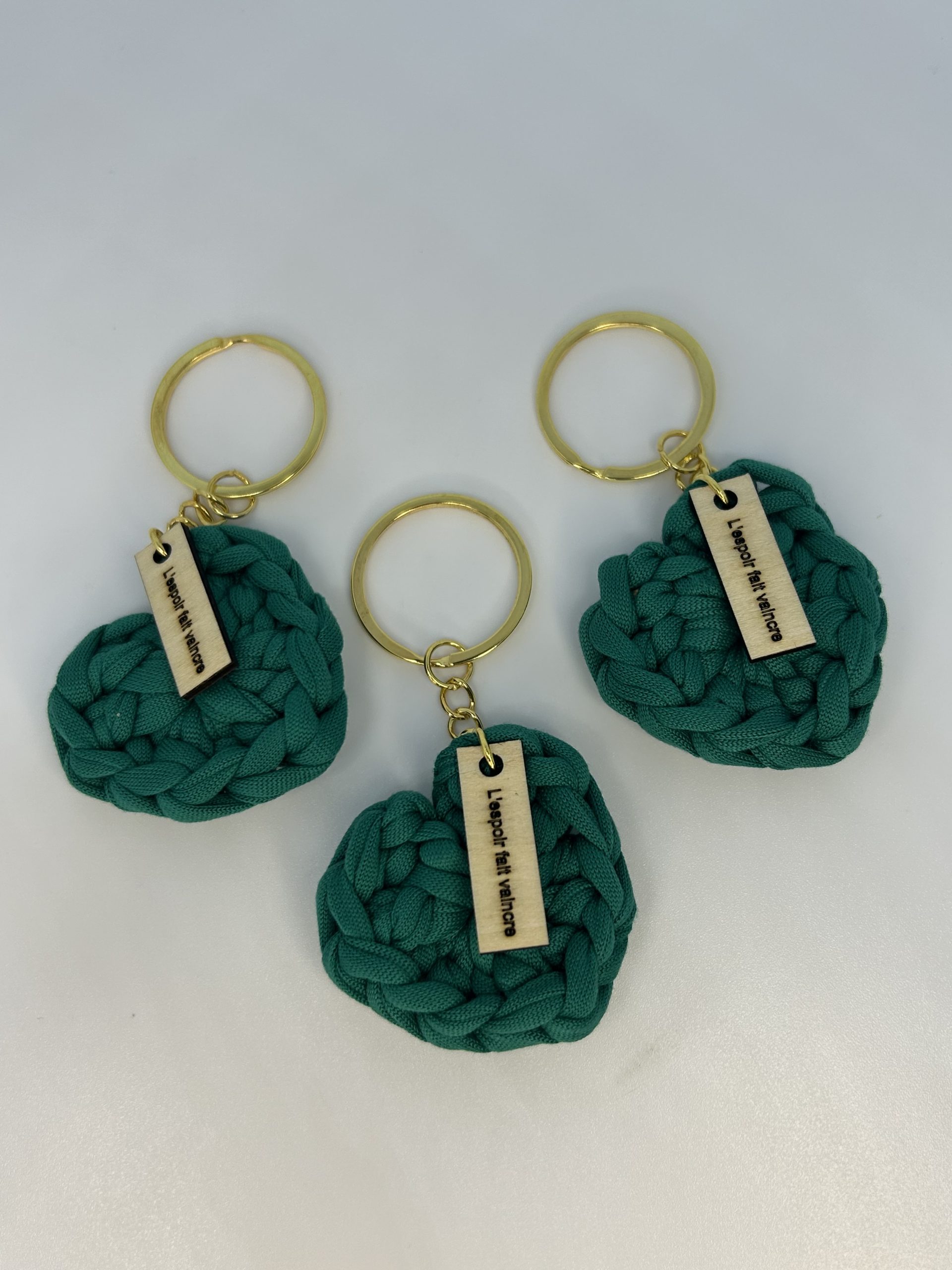 Emportez un symbole d’amour et de solidarité partout avec vous grâce à ce joli porte-clés en forme de coeur avec une breloque « L’espoir fait vaincre » créé par moi-même en crochet.