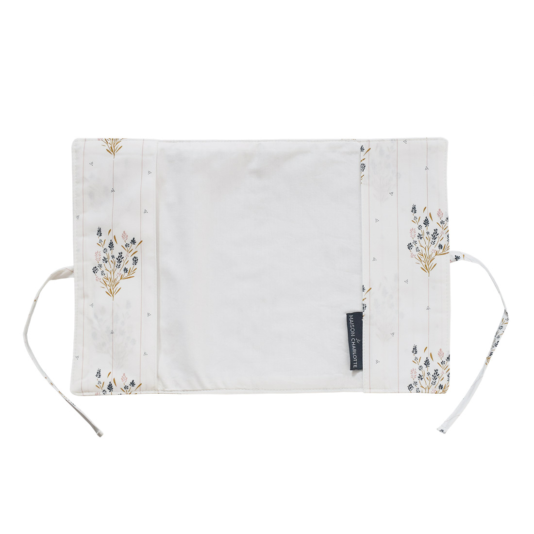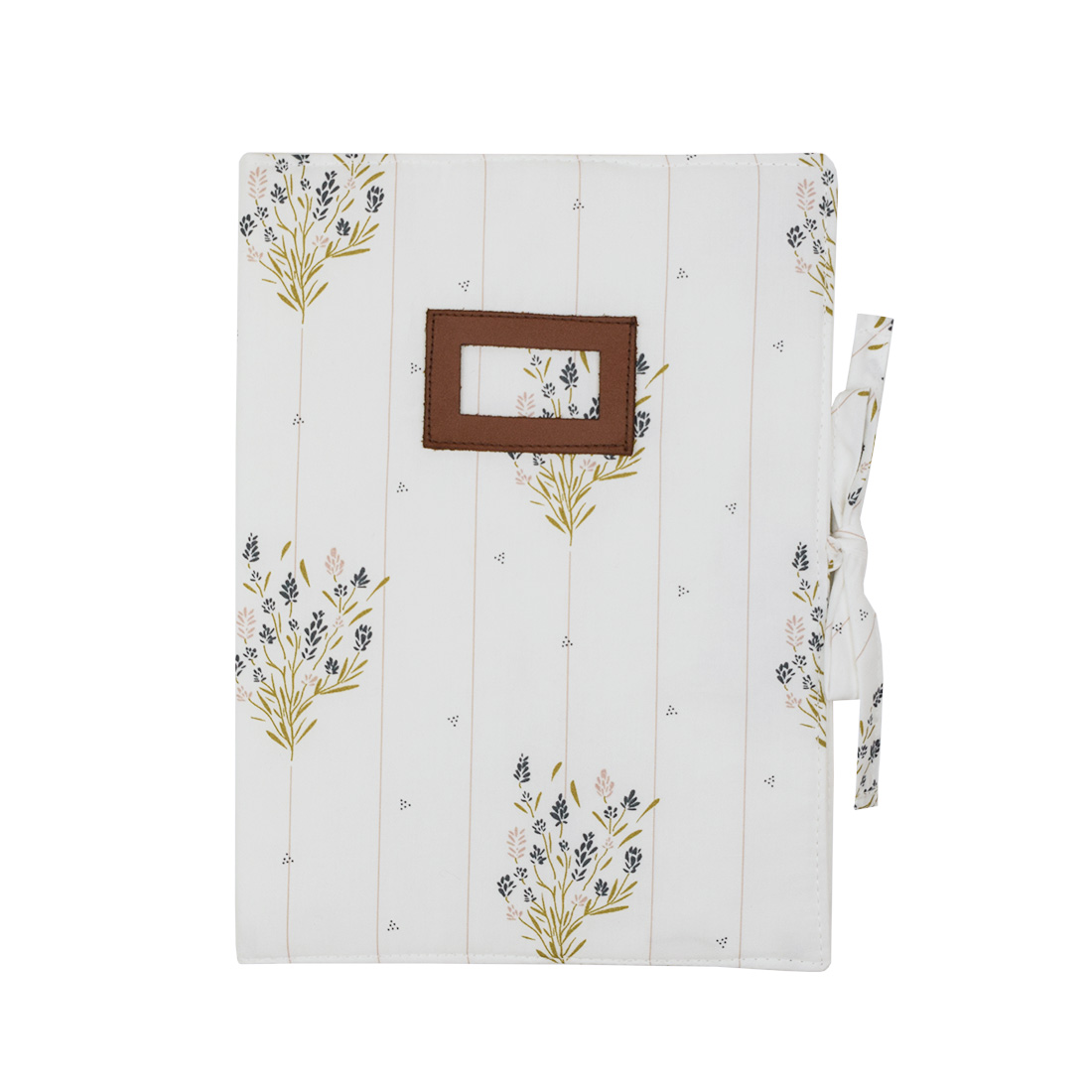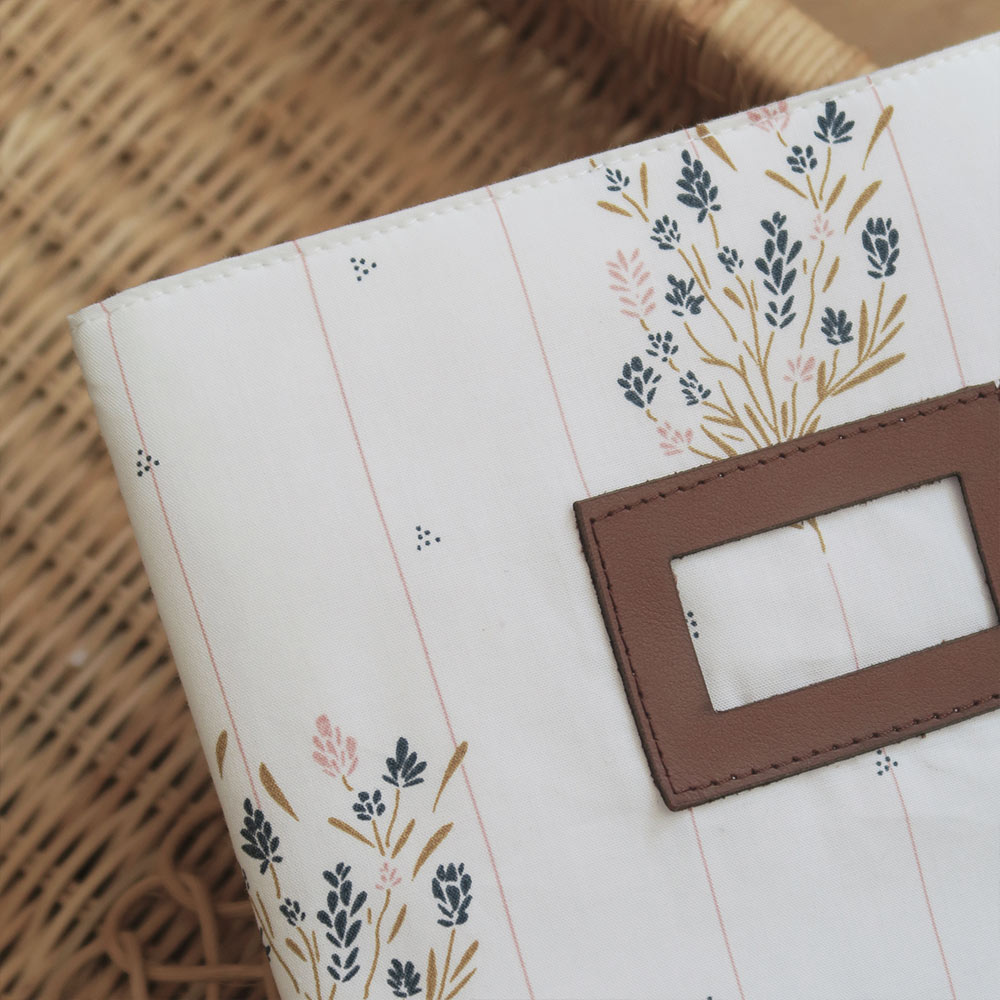 En voilà un joli protège carnet de santé, tout de fleurs décoré. Cette douce création est confectionnée en percale de coton bio avec de jolis liens en tissus qui permettent de le refermer. Il dispose également d’un porte-étiquette en cuir afin d’indiquer le prénom de votre tout-petit.
