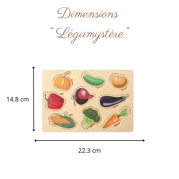 Le puzzle en bois « Légumystère » est composé de 9 pièces représentant des légumes du potager. Le plateau en bois mesure 22,3 x 14,8 cm, une taille idéale pour les petites mains et les sessions de jeu à la maison ou en déplacement.