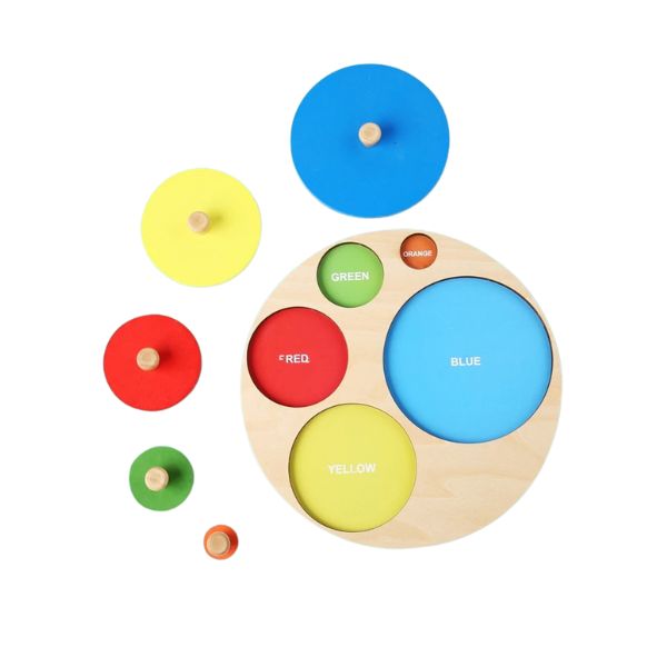 - Apprentissage des couleurs et des tailles: Rouge, jaune, bleu, vert, orange… Avec ce puzzle, votre petit bout apprend à reconnaître les couleurs tout en distinguant les différentes tailles de cercles. Qui a dit que les mathématiques étaient compliquées ?