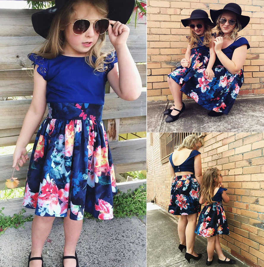 Robe couleur bleu marine, sans manches, avec des fleurs roses imprimées dessus. La robe PARISIENNE est disponible pour les enfants et pour la maman.