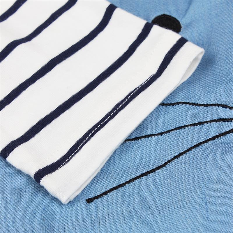 Le haut de la robe est blanc avec des rayures bleues (marinière). La partie inférieure de la robe représente une souris mignonne.