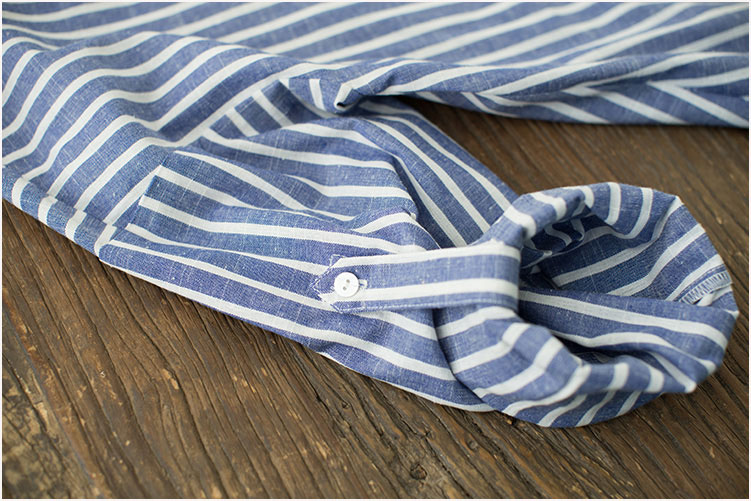 La robe arrive jusqu’aux genoux. Les manches sont longues mais il est possible de les retrousser et de les attacher avec un bouton. Au niveau de la poitrine la robe dispose d’une ouverture avec des boutons blancs. Elle dispose d’une ceinture fine assortie à la robe. Vous pouvez porter la robe avec ou sans ceinture.