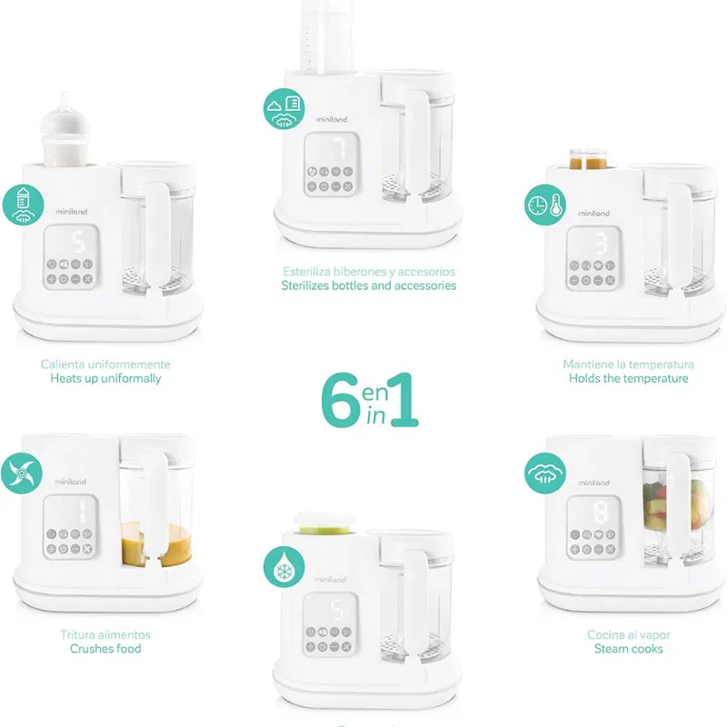 -Chauffe les biberons et petits pots de toute taille de manière rapide et uniforme -Stérilise les biberons et accessoires -Mixe toutes sortes d’ aliments -Cuit et chauffe les aliments à la vapeur, en conservant leurs nutriments -Décongèle les biberons et les petits pots -Maintient la température des biberons et des petits pots