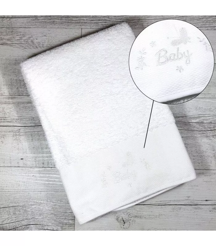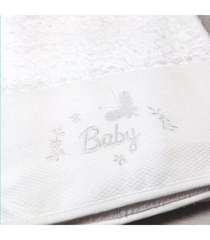 Une belle serviette pour bébé “trés chic ” en éponge douce et absorbante, avec une délicate broderie BABY papillon et petites fleurs brodés en blanc ton/ton et une large bande de tissu blanc fantaisie (esprit nid d’abeille). Serviette en éponge blanche 100%coton.