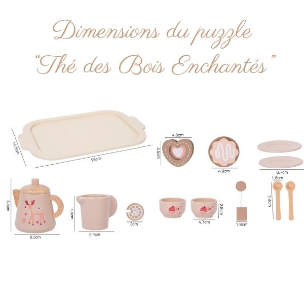 Parce qu’on sait que les parents aiment bien avoir les détails, voici les dimensions de chaque élément. Pas de doute, tout est parfaitement adapté aux petites mains de vos apprentis serveurs de thé.