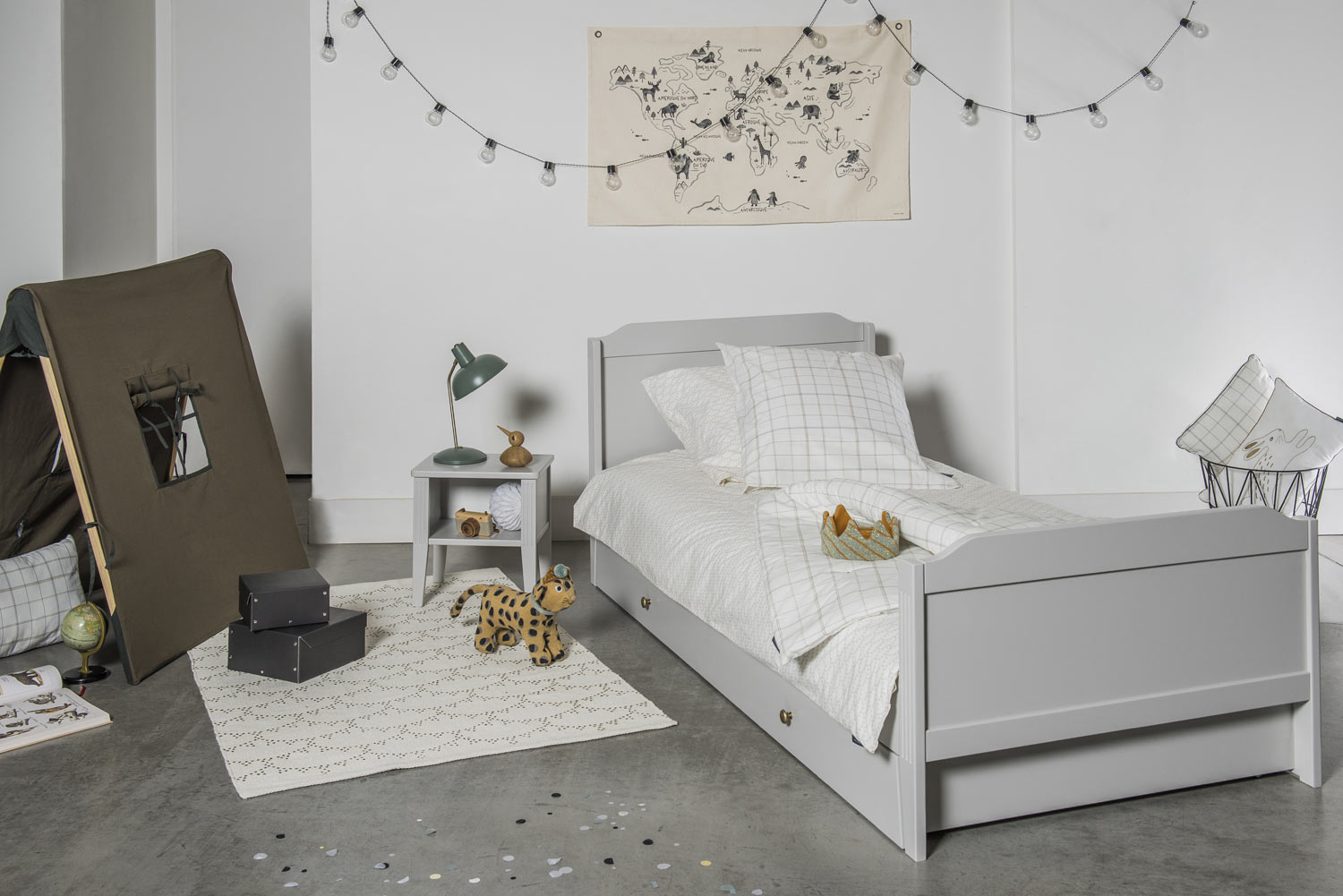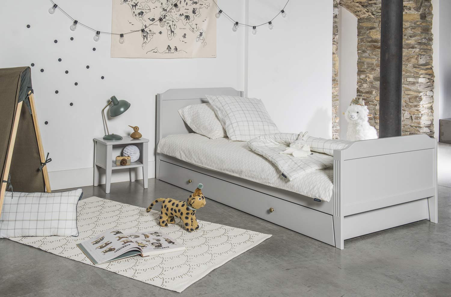 Maison Charlotte a pensé à un rangement supplémentaire sous le lit junior 90×200 Opéra, avec ce charmant tiroir lit. Décoré de poignées en laiton, ce meuble sans vis apparente a été réalisé avec des bords inclinés pour qu’il puisse se ranger correctement sous le lit aux pieds biseautés. Ce tiroir lit doté d’un fond plein offre un grand espace, parfait pour ranger les jouets de votre enfant ou pour accueillir un matelas supplémentaire.