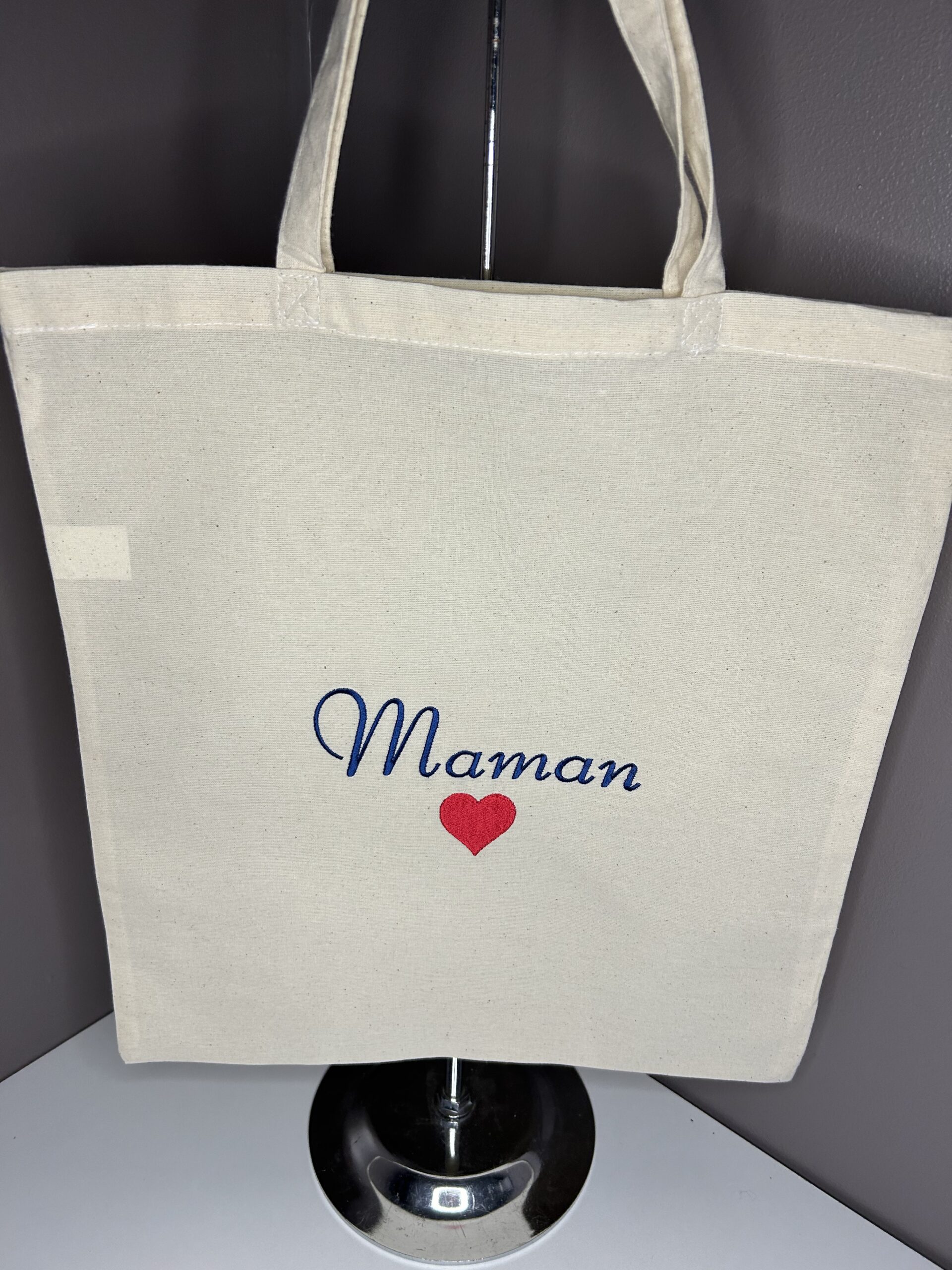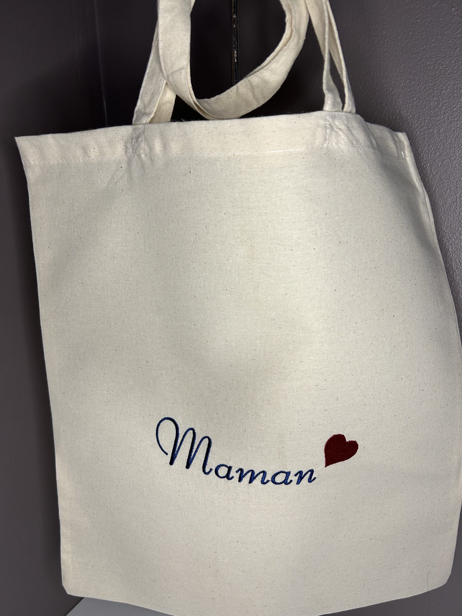 Vous souhaitez offrir un joli cadeau personnalisé à votre MAMAN chérie, je vous propose un tote bag brodé MAMAN avec un coeur.