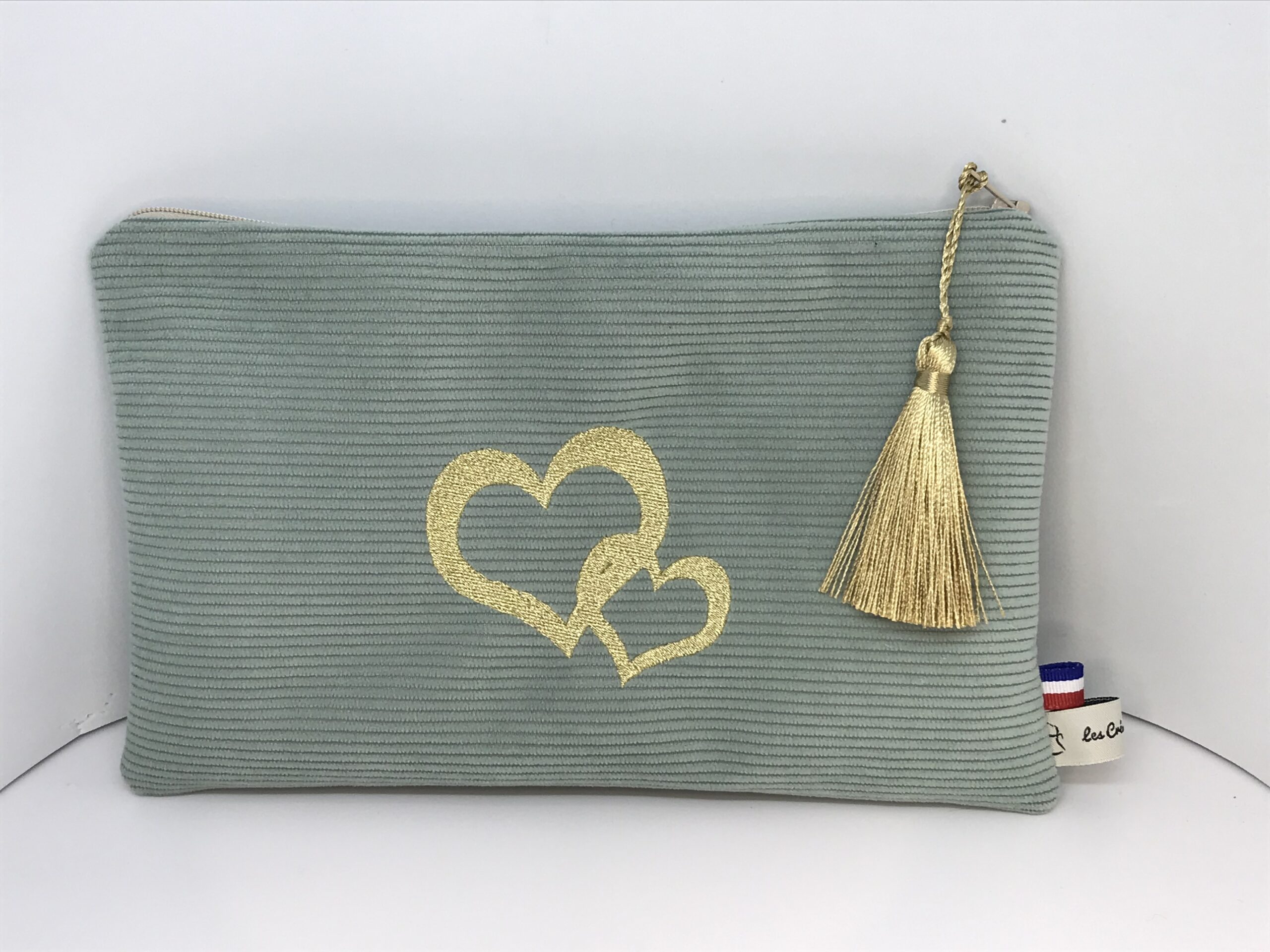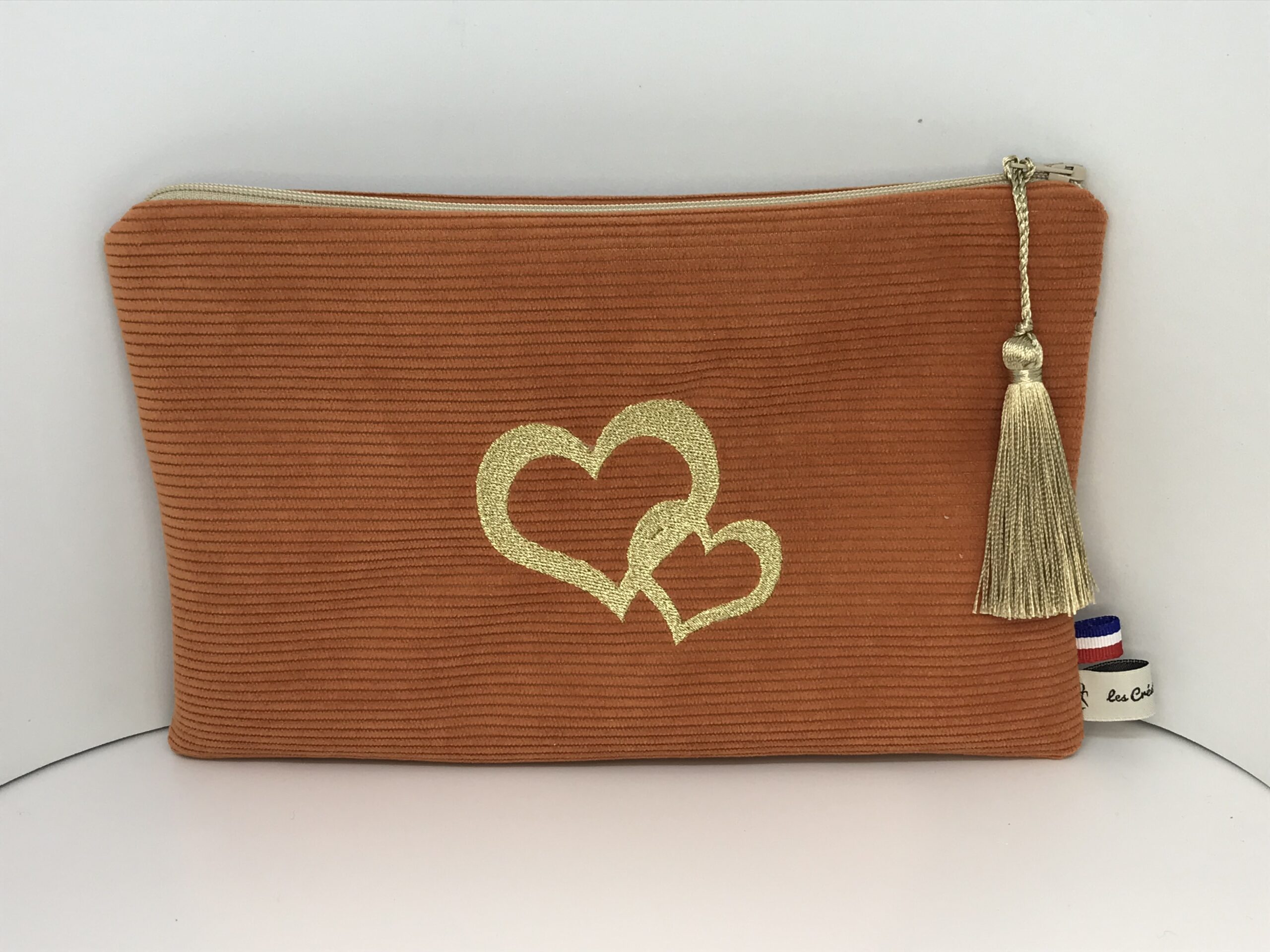 Vous pourrez ranger votre petit bazar dans cette très jolie trousse en velours côtelé avec coeur en broderie couleur or, agrémentée d’un pompon. A offrir pour la fête des Mamans ou à votre chérie.